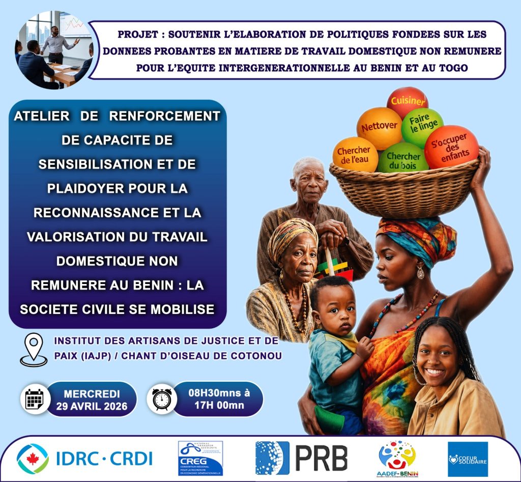 Le Consortium Régional pour la Recherche en Économie Générationnelle (CREG), en partenariat avec le Population Reference Bureau (PRB), l’Association d’Aide au Développement des Femmes du Bénin (AADEF-Bénin) et l’Association Cœur Solidaire (ACS), organise un atelier de plaidoyer et de sensibilisation sur la reconnaissance du travail domestique non rémunéré (TDNR). Cet atelier s’inscrit dans le cadre du projet :« Soutenir l’élaboration de politiques en matière de travail de soins non rémunéré pour l’équité intergénérationnelle au Togo et au Bénin », avec l’appui du CRDI et d’Affaires mondiales Canada. Il vise à renforcer la reconnaissance du travail domestique non rémunéré, majoritairement assuré par les femmes, et à promouvoir son intégration dans les politiques publiques. 🔎 Il s’agira de sensibiliser les acteurs sur les enjeux liés aux TDNR, de renforcer le plaidoyer pour des politiques publiques sensibles au genre, de mobiliser les organisations de la société civile autour d’une action collective, et de formuler des recommandations à l’endroit des décideurs. 👥 L’atelier réunira des représentants d’organisations de défense des droits des femmes, des acteurs politiques, des responsables d’institutions étatiques ainsi que des experts du CREG, qui assurera un appui technique et scientifique continu tout au long des travaux. 📅 Dates : 28 au 29 avril 2026📍 Lieu : Chant d’oiseau, Cotonou Les présentations introductives, les témoignages, les panels de discussion et les travaux de groupe seront suivis d’une session de restitution consacrée à la formulation et à la validation des recommandations. Partager via : D’autres actualités récentes