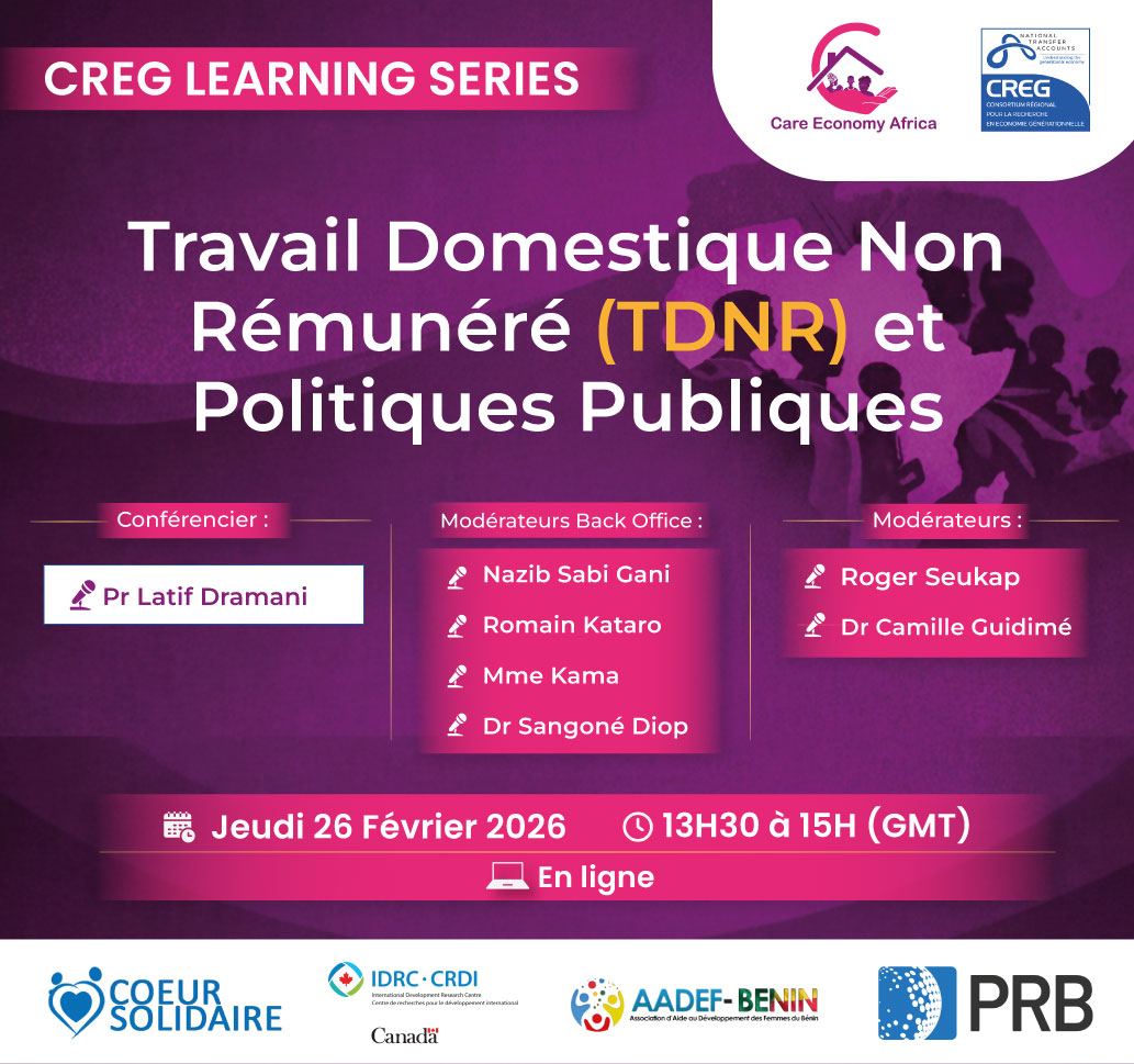 Titre : Clarifications Conceptuelles sur l’Économie des Soins et l’Économie GénérationnelleDate : Lundi 23 février 2026Heure : 13h30 – 15h00 GMT 🎯 Objectif généralRenforcer les connaissances et compétences des participants sur les approches conceptuelles de l’économie des soins et de l’économie générationnelle. 🏆 Résultats attendusÀ l’issue du webinaire, les participants auront :• Une compréhension claire des concepts d’économie des soins et d’économie générationnelle.• La capacité de décrire les changements démographiques au niveau individuel et structurel.• Les outils pour analyser et expliquer les impacts liés aux deux approches économiques. 👥 Public cible• Les parties prenantes du projet « Soutenir l’élaboration de politiques fondées sur les données probantes pour l’équité intergénérationnelle au Togo et au Bénin ».• Toute personne intéressée par l’économie des soins et l’économie générationnelle. 🎙️ Intervenants• Modérateurs : Roger Seukap, Dr Oga Jean Baptiste• Modérateurs Back Office : Mme Kama, Dr Sangoné, Nazib Sabi Gani, Romain Kataro• Conférenciers : Dr Camille Guidime, Edem Akpo 👉 Ne manquez pas cette opportunité d’approfondir vos connaissances sur deux concepts clés pour la planification du développement et l’équité intergénérationnelle. Partager via : D’autres actualités récentes