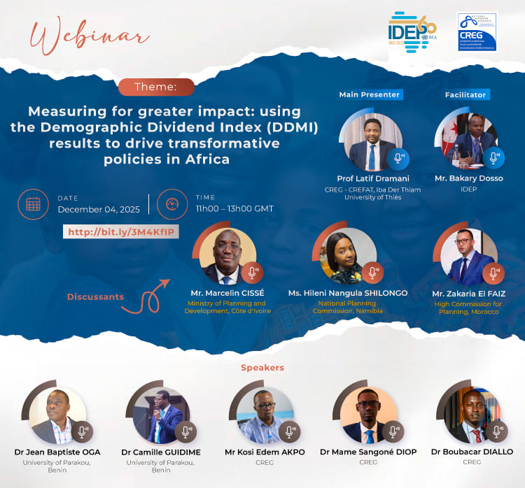 Ce séminaire, organisé par le Consortium Régional pour la Recherche en Économie Générationnelle (CREG) en partenariat avec l’Institut Africain de Développement Économique et de Planification (IDEP), vise à présenter les résultats du DDMI dans 20 pays africains, à engager une réflexion critique sur les recommandations politiques et à définir des pistes d’action pour renforcer l’impact des stratégies nationales et régionales.